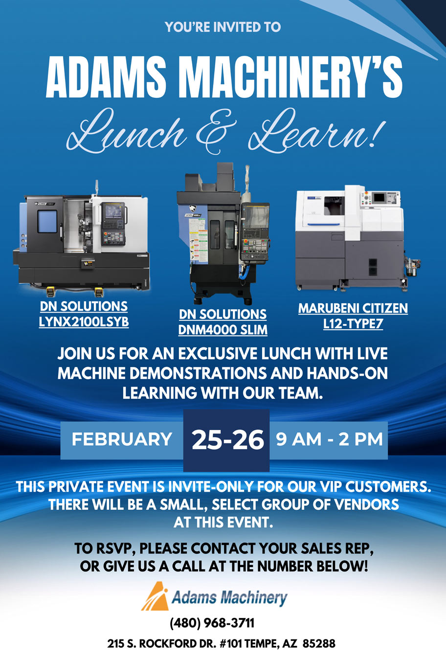 We were founded in 1967 by Ollie Adams and has been serving the metal working community of Arizona and New Mexico ever since. In 1991 Richard Short purchased Adams Machinery and has been operating in Tempe, Arizona.